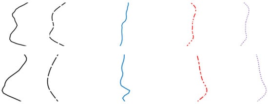 After data processing, well logging facies types were extracted by classifying distinct morphological patterns. Each morphological pattern is treated as a distinct category representing specific geological significance. By correlating these patterns with regional depositional contexts, sedimentary microfacies can be inferred. For this study, five well logging curves—natural gamma ray (GR), spontaneous potential (SP), acoustic (AC), laterolog deep resistivity (LLD), and laterolog shallow resistivity (LLS)—were selected as feature parameters due to their characteristics reflecting lithology, porosity, and sedimentary structure. These curves exhibit diverse morphologies, including composite patterns formed by combining two or more basic patterns. To facilitate machine learning analysis, numerical data from Figure 6 were converted into well logging curve images, transforming the well logging information into visual representations of logging facies.