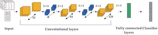2D-CNN srchitecture diagram. In the diagram, yellow blocks represent Convolutional Layers, blue blocks represent Pooling Layers, green blocks represent Fully Connected Layers, and gray blocks represent the Classifier.