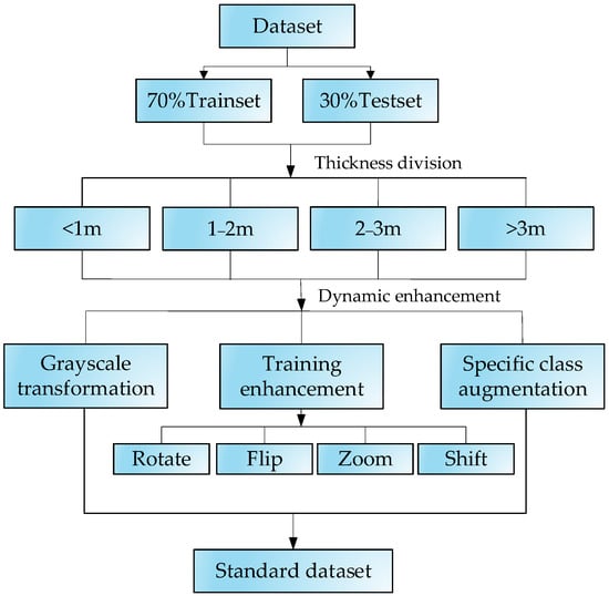 Due to stratigraphic thickness variations causing significant disparities in pixel dimensions across images, excessive thickness leads to severe stretching of thin-layer images (resulting in distortion), while insufficient thickness compresses thick layers, causing substantial loss of geological information. To address this, we implemented a thickness-based classification strategy. Based on statistical analysis of our training samples, the dataset was categorized into four stratigraphic thickness classes: >3 m, 2–3 m, 1–2 m, and <1 m.