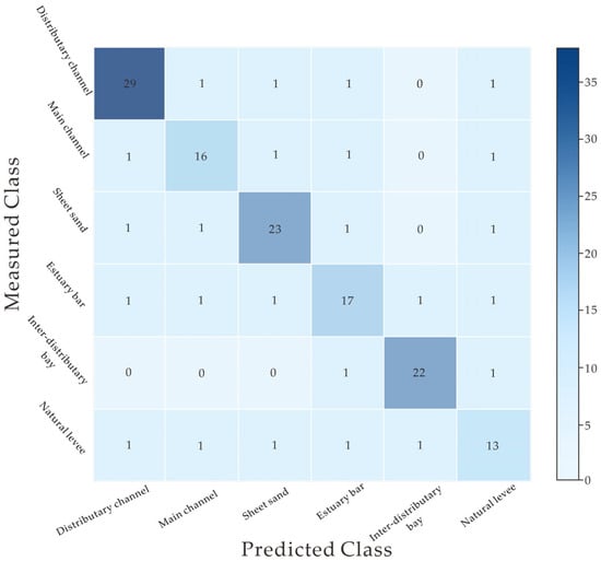 The confusion matrix experimental results shown in Figure 10 indicate that the classification model exhibits excellent performance in certain categories while facing significant challenges in others. Overall, the model demonstrates high prediction accuracy for “Distribution channel”, “Inter-distributary bay”, and “Sheet sand”, reflecting strong feature extraction capabilities. Due to the similarities in well logging curves between main channels and distributary channels, a portion of distributary channel images were misclassified as main channels. In the deltaic facies, the main channel and distributary channel are located within the delta plain, and their depositional environments are similar. Both have similar lithofacies characteristics, mainly composed of sandstone, with upward-fining sedimentary sequences, and they commonly develop tabular and trough cross-bedding with asymmetric ripple marks and scour-fill structures. However, there are differences in thickness variations and well logging curve morphologies between the main channel and distributary channel. The main channel is usually thicker than the distributary channel, and its well logging curves typically show high-amplitude bell or box shapes, while the distributary channel’s well logging curves may show low-amplitude bell or box shapes. The inter-distributary bay, characterized by uniquely identifiable well logging curves, achieved the highest recognition accuracy. In this study, the limited sample size of natural levee samples led to occasional recognition difficulties. However, the overall model performance underscores its reliability in identifying dominant depositional facies.