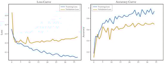 As depicted in Figure 11, the loss curves demonstrate that both training and validation losses decreased rapidly within the first five training epochs. By epoch 35, the training loss dropped to approximately 0.04, while the validation loss remained at around 0.42. The relatively close proximity of the two curves indicates strong generalization capabilities with no severe overfitting. The accuracy curves reveal an initial low accuracy that improved significantly during training. The training accuracy ultimately reached 0.85, while the validation accuracy stabilized at 0.75. Overall, the CNN model exhibits effective training performance characterized by continuous loss reduction, steady accuracy improvement, and minimal divergence between training and validation metrics, confirming robust generalization ability.