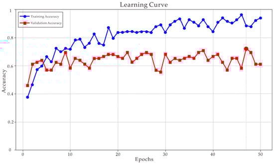 The learning curve graph illustrated in Figure 12 shows the variation trends of the training accuracy (depicted by the blue line) and validation accuracy (depicted by the red line) during the model’s training process. The training accuracy rapidly increased from an initial low value to around 0.8, and while experiencing slight fluctuations, it continued to rise steadily, reaching nearly perfect accuracy of 1.0 by the 55th training epoch. Meanwhile, although the validation accuracy improved in tandem, it consistently fluctuated around 0.6–0.7 without surpassing this upper limit. The divergence between these two curves indicates mild overfitting in the model, though the overall performance remains satisfactory.