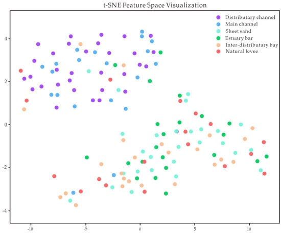 In Figure 13, the different depositional environments (such as the purple cluster of distributary channels and the red cluster of natural levees) form relatively independent clusters in the 2D space, indicating that the model has captured key differences in geological features. This separation holds important reference value for sedimentary facies identification research. The dispersed distribution of data points near the sheet sand may reflect transitional characteristics between the sheet sand and adjacent environments, and such detailed representations are helpful for understanding the boundaries of depositional systems.