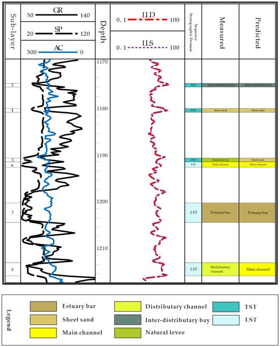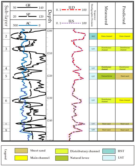 Figure 14 illustrates the sedimentary sequence in the depth interval of 1170–1218 m for Well W2-18-10, characterized by a transition from the lowstand system tract to the transgressive system tract, with sedimentary bodies evolving from channel deposits to thin sandstones. Within the depth range of 1190–1194 m, the measured depositional facies is sheet sand, but the model misclassifies it as a natural levee. Additionally, at depths of 1214–1216 m, the actual depositional facies is a main channel, yet the model erroneously assigns it to a distributary channel. These misclassifications primarily stem from discrepancies between resistivity response characteristics and microfacies attributes, potentially caused by GR curve noise interference due to wellbore enlargement or insufficient model sensitivity to the difference between deep and shallow resistivity measurements (LLD/LLS).