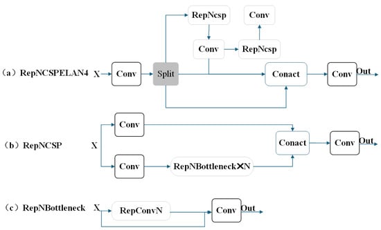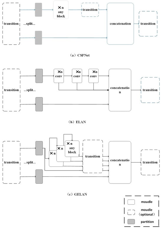 In addition, the research team proposed a newly designed, low-complexity network architecture, the General Efficient Layer Aggregation Network (GELAN), as demonstrated in Figure 4c. The General Efficient Layer Aggregation Network (GELAN) is built upon the Efficient Layer Aggregation Network (ELAN) architecture in Figure 4b by integrating the Cross-Stage Partial Network (CSPNet) from Figure 4a. Firstly, balancing computational complexity and detection accuracy is at the core of the design. GELAN optimizes the model’s computational requirements through modular design, ensuring that even under limited computational resources, high detection accuracy can still be maintained. Secondly, lightweight convolution operations are introduced between each convolutional layer, reducing computation, which is particularly suitable for edge devices or low-power environments, thus lowering the computational cost during inference and improving processing speed. The authors also improve computational efficiency by incorporating the Cross-Stage Partial Network (CSPNet), which distributes the computational load across different stages and network blocks, preventing excessive computation at any single stage and enabling flexible adjustment of computation based on hardware conditions. Dynamic resource adjustment allows GELAN to dynamically optimize the allocation of computational resources according to hardware conditions, ensuring high inference efficiency even when resources are limited. Finally, the modular design of the model, through the rational combination and integration of different network layers and modules, maintains high detection accuracy without adding excessive computational burden. The design of this architecture considers the balance between computational complexity and detection performance, ensuring that the model maintains high inference efficiency even with limited computational resources.