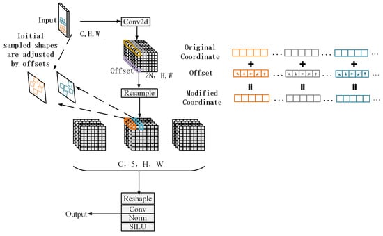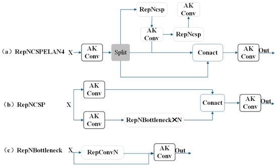 The Backbone is responsible for extracting initial features from the input image. The Convolutional Block Attention Module (CBAM) [] is integrated into the Backbone to focus on important regions of the image. By leveraging both spatial and channel attention mechanisms, CBAM enhances critical information while suppressing noise and irrelevant regions, thereby improving the feature extraction capability for low-quality images. The Adaptive Kernel Convolution (AKConv) [] is combined with the RepNCSPELAN4 module to expand the receptive field and enable the network to capture finer spatial features, enhancing its adaptability to images of varying quality and size. Additionally, the SPPFELAN module further aggregates and refines these features.