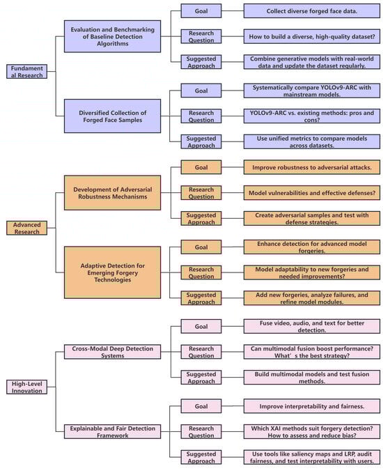 Despite the strong performance of YOLOv9-ARC in detecting low-quality forged facial images, several research opportunities remain across different levels of difficulty and innovation. As shown in Figure 9, future work can be structured into three progressive layers.