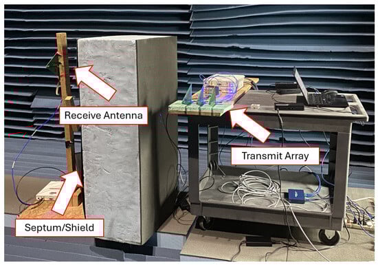 In this quasi-monostatic transmit/receive setup, we expect some level of sidelobe leakage from the transmit array to the receive antenna; therefore, we constructed a septum with an embedded aluminum sheet to shield the receive antenna. The MF threshold is then set by taking the MF response when the transmitters are on and no target is present.