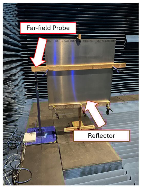 In this section, we show the results from a binary target detection test of a stationary target performed in an anechoic chamber. The reflector used during this collection is a  flat aluminum sheet stabilized with wooden boards that were adjusted using two laser pointers so that the bowing across the sheet was less than 6.4 mm ( in). The block diagram of the system is shown in Figure 1, and photographs of the experimental setup inside the chamber are shown in Figure 5 (transmit/receive system) and Figure 6 (reflector).