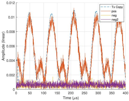 We take measurements of the target echo from the locations  (3.35 m, 0°), (6.70 m, 0°) and show the results for the latter in Figure 7. The captured target echo (solid) matches well with the copy of the transmitted waveform (dashed), demonstrating that the experimental fast-time RCS behavior agrees well with []. Also included in Figure 7 is the interference plus noise sample data, providing a visual representation of the neg-pos-neg test in Section 3.4.