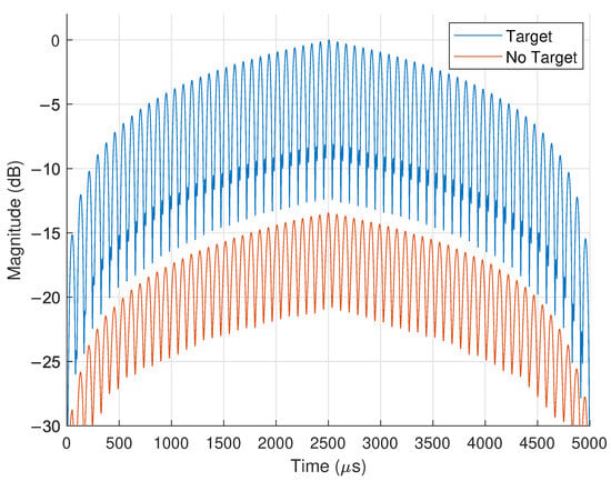 As can be seen from Figure 7, there is a stark contrast between the sampled data with and without the presence of a target in the far field; thus, as expected, the MF responses closely follow the sampled data from the receive antenna. Figure 8 shows the binary target detection MF response calculated using Equation (9) at  (6.70 m, 0°). There exist differences of approximately 13.2 dB and 13.4 dB, respectively, between the MF responses of the positive and negative tests at this location. These increases in MF strongly suggest the presence of a target in the far field when compared to the cases when no target is present.