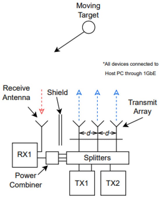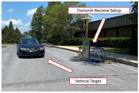 In this section, we capture the response from two moving targets: one car and one drone. The block diagram for the setup is shown in Figure 9, and the corresponding photographs are shown in Figure 10 and Figure 11, respectively. The maximum detectable range of a  target for this test is , found by evaluating Equation (11) with  and the minimum receive power . Target sampling occurs at an approximate range of  and  for the car and the drone, respectively. During the drone collection, the drone followed a direct line-of-sight trajectory along boresight during both collections. The drone was flown as close to a constant height as possible, yielding a radial velocity living mostly in the range–angle plane of the radar.