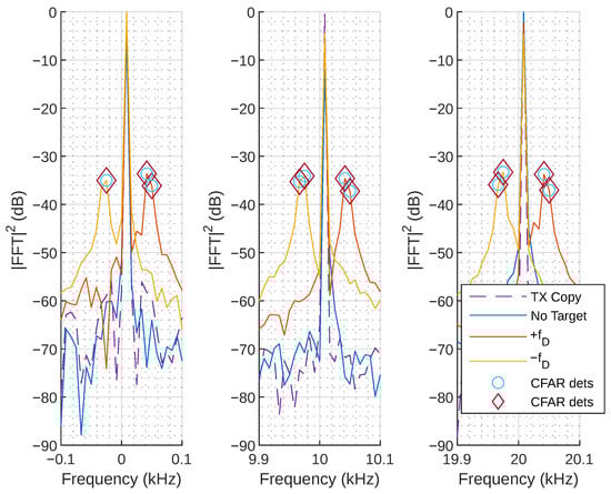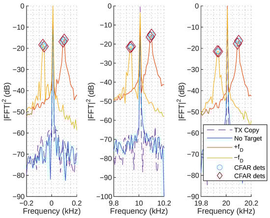 Ettus Research documentation states that the UBX-160 daughterboard has an experimentally determined minimum discernible signal (MDS) level of −135 dBm in the HF band []. We empirically find the MDS level (−65 dBm) inside the chamber by taking interference plus noise measurements with the transmitters on, then sampling input tones with decreasing power until the amplitude falls below the interference plus noise level. Assuming a lossless system, a 0 dBsm target yields a maximum detectable range  found using the radar range equation
