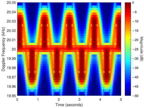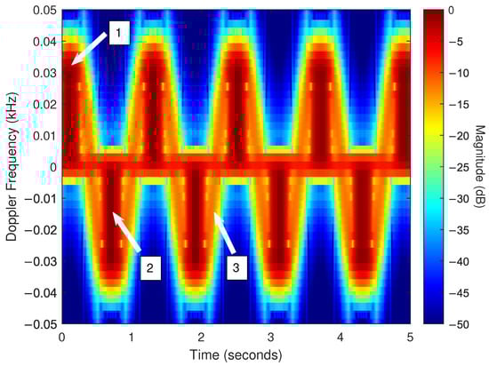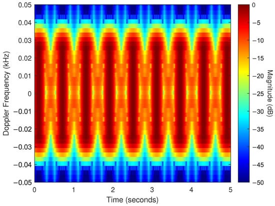 Time–frequency analysis of the simulated micro-Doppler response from a two-blade propeller with operational parameters , , and .
