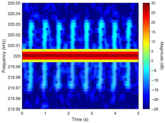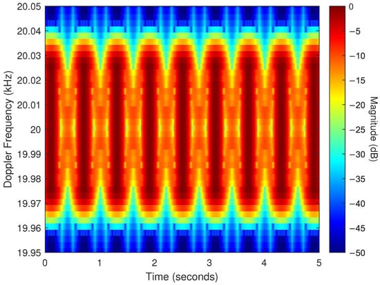 Time–frequency analysis of the experimentally captured micro-Doppler response from a two-blade propeller with operational parameters , , and .