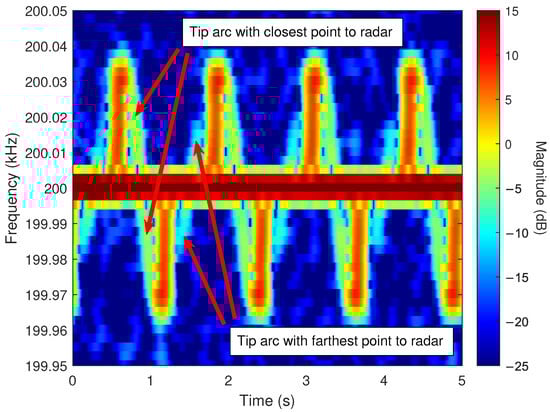 The time–frequency analysis of the single-blade collection is shown in Figure 22 and Figure 23. Figure 22 and Figure 23 both exhibit periodic blade flashes, strong scattering from the blade tip, and a sinusoidal trace produced by the tip of the rotating blade. Note that the sinusoidal trace produced by the tip of the rotating blade, while present throughout each rotation, is more intense when the blade is at its closest point to the radar. This effect is annotated in Figure 22.