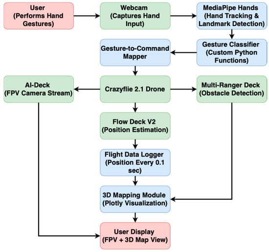 The architecture of the proposed drone control system integrates multiple hardware and software components to enable intuitive, gesture-based drone navigation with obstacle avoidance and 3D mapping. The user initiates control by performing predefined hand gestures in front of a webcam. These gestures are captured and processed using Google’s MediaPipe Hands framework. The landmark data are analyzed using custom Python classification functions that determine the type of gesture being shown. Using a command-mapping module, each recognized gesture is mapped to a specific flight command.
