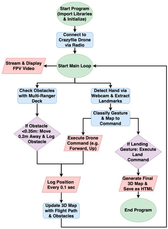 The full drone control system was implemented in Python, integrating hand gesture recognition, autonomous obstacle avoidance, 3D mapping, and AI-Deck video streaming. Upon startup, all necessary software libraries are imported, and the system establishes a wireless radio connection to the Crazyflie 2.1 drone. A socket connection is simultaneously opened to the AI-Deck for FPV streaming. Google’s MediaPipe Hands framework is initialized to process webcam input and track 21 hand landmarks, which are later used for gesture classification. In parallel, the drone’s position is logged using the Kalman filter output from the Flow Deck V2, and a blank 3D map is initialized using Plotly to visualize flight data and obstacle encounters.