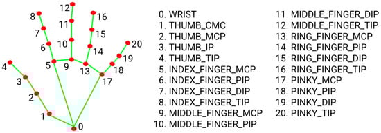 - Google. Hand Landmarks Detection Guide. Available online: https://ai.google.dev/edge/mediapipe/solutions/vision/hand_landmarker (accessed on 4 May 2025).