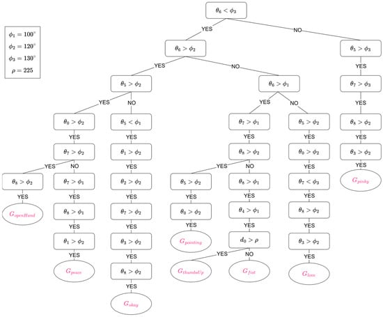 where the determined gesture class and indicates any unspecified hand gestures. This classification can also be implemented using a decision tree, as demonstrated in Figure 6. It is noteworthy that in the decision-tree diagram, the unspecified hand gesture is ignored.