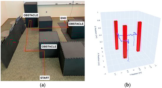 A 3D mapping system was implemented to visualize the drone’s flight path and detect obstacles. The system recorded the drone’s x, y, and z coordinates at 0.1 s intervals, logging its movement throughout the flight. Obstacle detection data from the Multi-Ranger Deck were incorporated into the map, with obstacles represented as rectangular prisms positioned at a distance from the detection point based on the safety threshold.