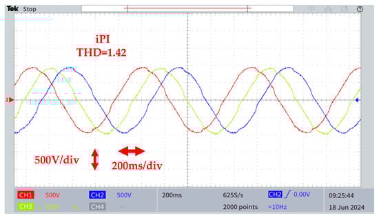 This test demonstrated the effectiveness of the proposed method in terms of power quality, with a total harmonic distortion (THD) of 1.18%, compared with 1.42% and 1.76% for the iPI and PI strategies, in the presence of a nonlinear load, as shown in Figure 16.