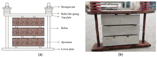 Before the erosion test, the ultimate bending load of a group of specimens was tested first. Then, a group of specimens was selected for monotonic loading, with 5% of the ultimate bending load as the first-level load. At each load level, a reading microscope was used to observe the cracking condition of the specimens. The results showed that no obvious cracks were observed within the range of 40% of the ultimate bending load, and obvious micro-cracks appeared after exceeding 40%. Therefore, in this study, 20% of the ultimate bending load in the elastic state and 40% of the ultimate bending load in the proportional limit state were, respectively selected as the applied bending loads. During the erosion process, to prevent stress changes, the spring length was tested weekly and the spring stiffness coefficient was tested monthly, and the load was re-applied. To prevent the loading device from rusting due to the action of the erosion solution, the stress loading device was painted before immersion. The side of each specimen without an epoxy resin adhesive coating was designated as the bending and tension surface. A schematic representation of the loader is provided in Figure 1.