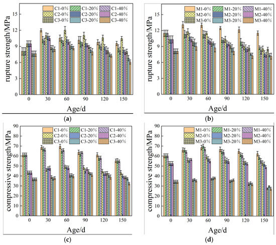 Figure 2 illustrates the influence of load and sulfate coupling on the cementitious materials’ properties of cementitious materials. It is evident from Figure 2a–d that both the compressive and flexural strengths of the mortar and concrete, subjected to varying flexural loads, exhibit a general trend characterized by an initial increase followed by a subsequent decline. The peak values for the flexural and compressive strengths were achieved after completing 60 days of wet–dry cycles.