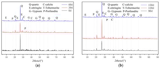 Figure 3 illustrates the XRD patterns of cement-based materials subjected to sulfate attack. As shown in Figure 3a, the primary phases at day 0 include hydrated calcium silicate, quartz, ettringite, calcite, gypsum, and portlandite gel. In the absence of erosion, neither gypsum nor ettringite is detected in the XRD diffraction patterns. As depicted in Figure 3b, with prolonged erosion exposure, diffraction peaks corresponding to gypsum and ettringite become evident, confirming that these compounds are byproducts of sulfate-induced degradation in cement-based materials. Initially, ettringite and gypsum fill the internal pores within the specimen; however, as their concentrations exceed a critical threshold, internal expansion occurs within the cement matrix. When this expansion force surpasses the tensile strength of the specimen, cracking is initiates. The flexural and compressive strengths of the cement-based material specimens initially increase but subsequently decrease.