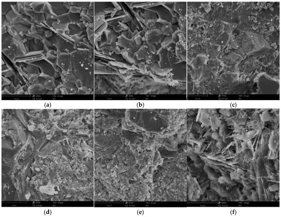 Figure 4 presents a scanning electron microscope (SEM) image of the cementitious material subjected to sulfate erosion; (a), (b), (c), (d), (e), and (f) are the microscopic images of sulfate attack at 0 d, 30 d, 60 d, 90 d, 120 d, and 150 d, respectively. From Figure 4, it can be inferred that when the specimen is unaltered by erosion, its internal structure appears relatively smooth with a limited number of pores, indicating the incomplete hydration of the cement. At an erosion duration of 30 days, minor columnar or plate-like erosion products begin to emerge within the specimen. By 60 days of erosion, there is an increase in these products while the internal pore volume decreases; this phenomenon can be attributed both to the complete hydration of the cement and to the formation of erosion products that fill existing pores. At 90 days, numerous columnar or plate-like erosion products accumulate inside the specimen. When reaching an age of 120 days, the substantial accumulation of these products generates significant swelling forces that lead to micro-crack formation within the specimen. Upon reaching 150 days, there is a continued increase in erosion products, alongside a notable presence of needle-like calcarenite structures. As erosive aging progresses further, marked alterations in the internal microstructure are observed; specifically, prolonged exposure results in enhanced crystallization and swelling product formation within the cementitious material, while simultaneously reducing pore space.