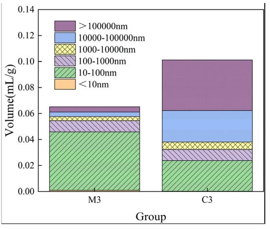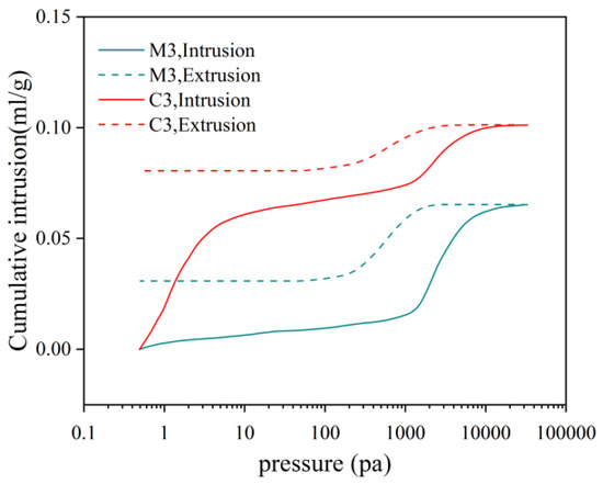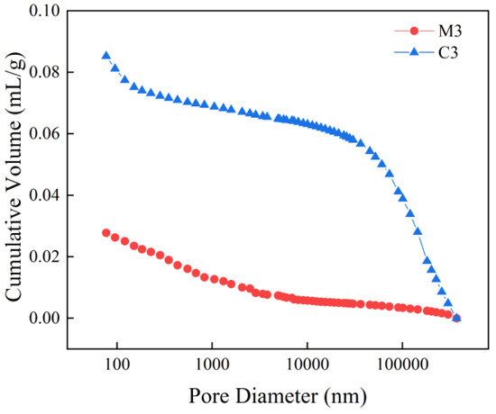 Figure 5 illustrates the graphs depicting the incoming and outgoing tribute pressure for C3 and M3. Under conditions of a constant water–cement ratio, the volume of mercury intake exceeds that of mercury withdrawal. The incorporation of fine aggregates results in a decrease in the amount of incoming mercury, while the addition of coarse aggregates leads to an increase in the incoming mercury; however, this value remains lower than that observed for net slurry. Both the total porosity and effective porosity exhibit an initial upward trend followed by a subsequent decline. During the mercury pressure test, liquid mercury penetrates into the material’s pores under applied pressure, and upon cessation of this pressure application, some liquid mercury is retained within these pores. Consequently, the volume of incoming mercury surpasses that of outgoing mercury; this residual portion resembles ink bottle holes [33]. Pores that can freely discharge after unloading are classified as effective pores. Effective pores serve as primary conduits for moisture transport and erosion mediums, which are critical determinants influencing material durability.