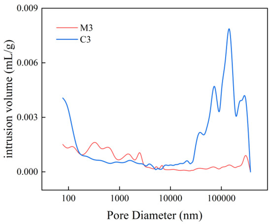 Figure 6 and Figure 7 present the pore size distribution curves for C3 and M3 alongside their corresponding cumulative suction curves. In Figure 6, it is observed that within the pore diameter range of 100 nm to 10,000 nm, the pore size distributions of mortar and concrete are essentially comparable. However, when the pore diameter falls below 100 nm or exceeds 10,000 nm, the intrusion volume of concrete surpasses that of mortar. Regardless of pore size, Figure 7 indicates that concrete contributes more significantly than mortar; specifically, this contribution is approximately three to five times greater for concrete in the pore size range of 100 nm to 100,000 nm. Under identical water–cement ratio conditions, both the pore size and mercury intake exhibit a trend where concrete > mortar. This phenomenon can be attributed to increased non-homogeneity as coarse aggregates are incorporated into the mix, resulting in a substantial rise in porosity.