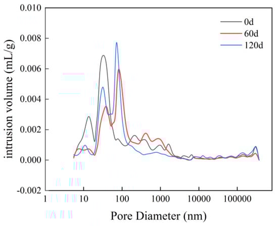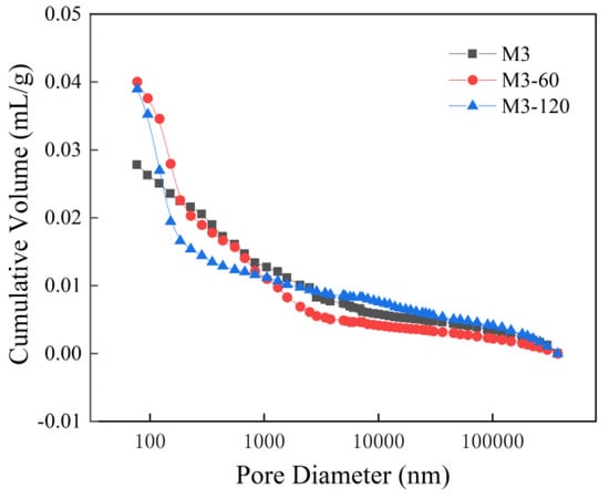 The pore size distribution curves and cumulative contribution curves for M3 withvarious erosion durations of M3 are illustrated in Figure 8 and Figure 9. As depicted in Figure 8, it is apparent that for pore diameters of less than 100 nm, the cumulative distribution of sulfate erosion at 60 days exceeds that observed at 120 days, which in turn surpasses the values recorded for samples without any erosion. For pore diameters ranging from 100 nm to 1000 nm, the cumulative distribution indicates that un-eroded samples exhibit a greater value than those subjected to sulfate erosion for 60 days, but fall short compared to those eroded for a period of 120 days. In the range of pore diameters from 1000 nm to 100,000 nm, the cumulative distribution reveals that sulfate erosion after 120 days is greater than that of both the un-eroded samples at day zero and those eroded for 60 days.