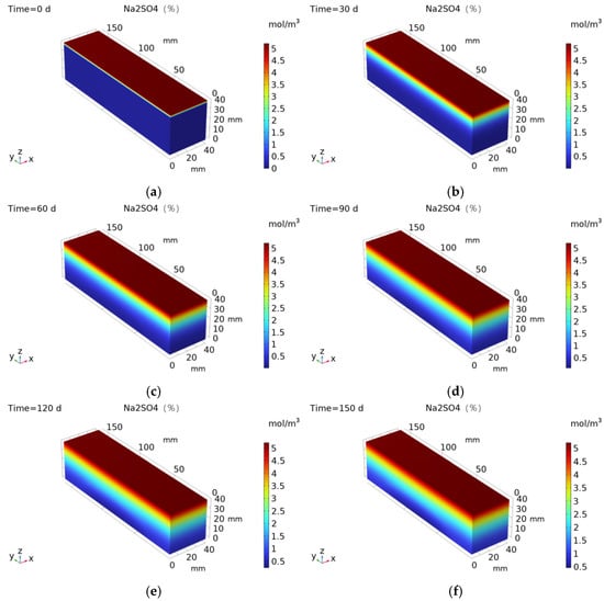 Numerical simulation of sulfate ion concentration: (a) 0 d; (b) 30 d; (c) 60 d; (d) 90 d; (e) 120 d; and (f) 150 d.