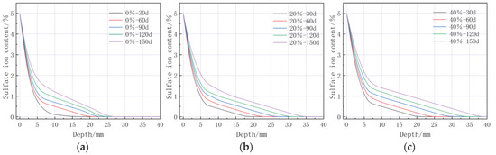 Sulfate ion concentrations at different depths under different bending stresses: (a) 0% bending stress; (b) 20% bending stress; and (c) 40% bending stress.