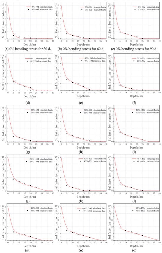 Figure 15 presents a comparison of the simulated results and the measured sulfate ion concentrations (obtained through EDTA complexometric titration) at various ages and depths under different magnitudes of bending stress. The figure indicates that the measured sulfate ion concentrations at varying depths are generally consistent with the simulated results across different bending stresses and erosion ages, with an error margin of approximately 5% observed only at a depth of 5 mm. This discrepancy can be attributed to the porous nature of cement-based materials, where applied stress alters the internal pore structure and increases micro-crack formation, leading to some deviation between the experimental and simulation outcomes. However, according to Sharifi and Wu et al. [25,43,44], a simulation error of 5% is within the allowable range. Additionally, as illustrated in the figure, the impact of bending stress on erosion diminishes as the erosion age increases. Consequently, after a certain point in the erosion age, bending stress ceases to enhance sulfate erosion.