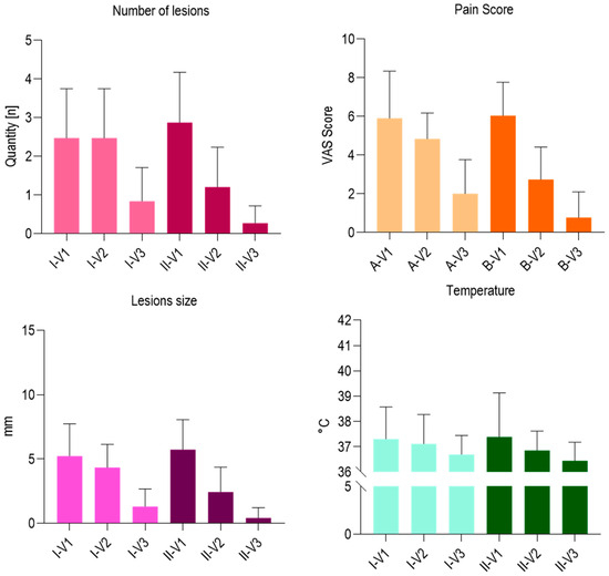 By means of the Kruskal–Wallis model, the significance of the study variables was tested. At the baseline, the number of lesions was not significant compared with groups I and II (p > 0.05), but significant at V2 and V3 (p = 0.013). There were no significant differences between groups I and II in the size of the lesions measured at the baseline (p > 0.05), but statistically significant differences at V2 and V3 (p = 0.0407). There were no significant differences between groups I and II in the measurement of pain measured with the VAS scale (p > 0.05), whereas a statistically significant difference was detected at experimental times V2 and V3 (p = 0.0094). There were no significant differences between groups A and B in temperature measurement (p > 0.05) and at the experimental times of V2 and V3 (p > 0.05) (Figure 1). No deviations, side effects, or adverse reactions to treatment were recorded in groups I and II. No drop out was recorded in the study population.