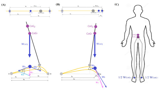 Diagram of the ground load of the body weight (WCoG1) through the foot in the general body centre of gravity CoG1 inclination (including the support platform). (A) CoG1 deflection forward, (B) CoG1 deflection backwards. (C) Diagram of the human body with the general body centre of gravity (CoG1) and body weight symmetrically distributed on two feet. In a standing position on both feet, the load on each foot is equal to half the body weight value. A—front support point, B—rear support point, WA and WB—load on the front (A) and rear (B) support points, respectively, WJ—resultant of the forces of gravity WA and WB, WB’—vector parallel to WB with the same value, γ [°]—the angle between the vector WA and WB’ lying opposite the vector WJ, rCoG1—the arm of the gravity force of the general centre of gravity CoG1, rA—distance from point A to the projection of WCoG1 on the support platform, rB—distance from point B to the projection of WCoG1 on the support platform, rD—distance from point A to B, grey point with a cross – axis of rotation in the upper ankle joint.