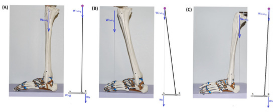 In a very simplified way, in the neutral position, the weight of the whole body (WCoG1) falls on the upper ankle joint axis, and from this is distributed between two main support points in the foot, i.e., the head of the first metatarsal bone (point A) on one side and the calcaneal tuberosity on the other (point B). Based on the principle of balancing the moments of forces in a loaded beam, the values of the load forces were determined at points A and B (WA and WB) (Figure 4A). For the model human foot, the distance from point A to the axis of the upper ankle joint (rA) is 0.13 m, and the distance from point B to the axis of the upper ankle joint (rB) is 0.045 m, WA and WB can be calculated from Formula (8).