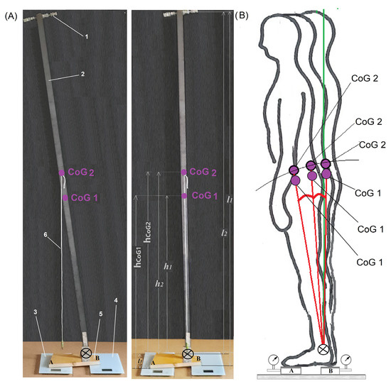 A model system was with a height of l1 = 2.06 m, which consisted of a metal flat bar (l2 = 2 m, width: 0.03 m) with a threaded rod with nuts imitating the weight of the human head placed at one end, and on the other side with a hinged platform imitating the footplate (lamina pedis). The height of the foot with the hinge is l3 = 0.06 m. The hinge in this system imitates the talus bone with a trochlea. The weight of the tilting part of the model (flat bar + rod with nuts) was 2.648 kg, and the entire system, together with the platform imitating the foot, was 2.972 kg. The centre of gravity for the tilted part of the model (CoG2) (without the support platform) is located at a height of 1.1 m (h2) from the axis of rotation, and 1.16 m from the ground (1.1 + height of the platform with a hinge of 0.06 m) (hCoG2). On the other hand, the general centre of gravity for the entire system (CoG1) together with the platform and hinge is 0.01 m lower, i.e., at a height of 1.15 m (hCoG1) measured from the ground, and measured from the axis of rotation at a height of 1.09 m (h1). The line indicating the projection of the centre of gravity on the support platform was obtained by mounting a cable with a weight at the centre of gravity point of CoG2. The hinge connecting the tilted part and the support platform imitates the upper ankle joint. Subsequent degrees of flat bar tilt relative to the support platform were stabilised by tightening the screw on the axis of rotation. Two scales (EKS002W, 1–5000 g, Digital scale, Esperanza-Extrim-Titanium, Ożarów Mazowiecki, Poland) were used to measure the ground load of the object (Figure 3A). The readings on the scales were checked based on standard weights of 0.5 kg and 1 kg. Before each weighing, the scales were tared. It was performed twenty-two repetitions of the gravity measurements at points A and B at each degree of flat bar inclination.