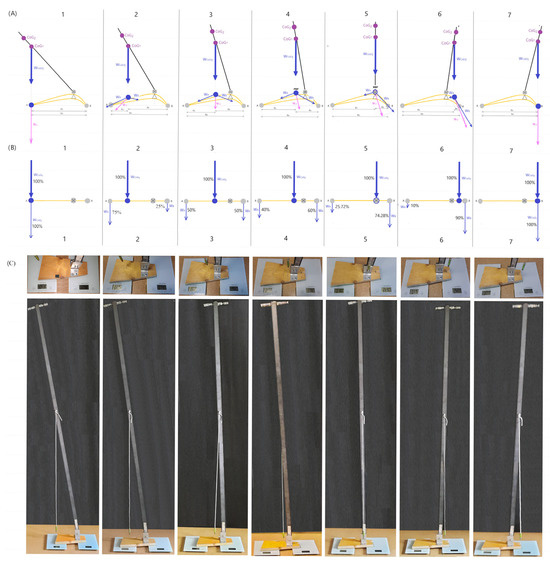 The ground loads were measured at the extreme support points A and B in seven situations, i.e., from the maximum forward inclination of the object’s centre of gravity (CoG1) through the neutral position to the maximum backwards inclination of the model object while maintaining balance (Table 1) (Figure 4C).
