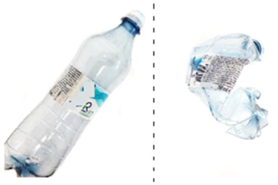 Original PET bottle and volume reduction of PET bottle post-flattening.