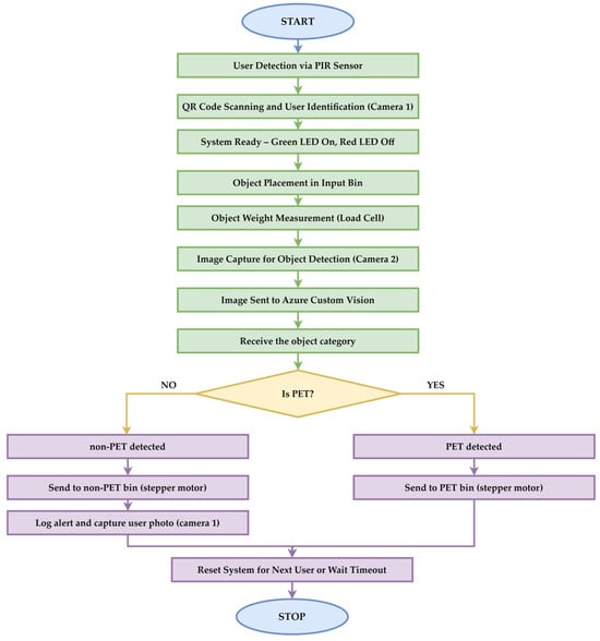 Numerous studies [32,33] review various plastic identification methods and emphasize the integration of sensors and IoT technologies for multi-source perception, intelligent identification, and data processing. Cui et al. [34] highlight challenges, such as fraud detection and real-time updates, to optimize user satisfaction and the recovery rate of plastic bottles. The identification subsystem for plastic bottle waste processing can be designed based on the following components: