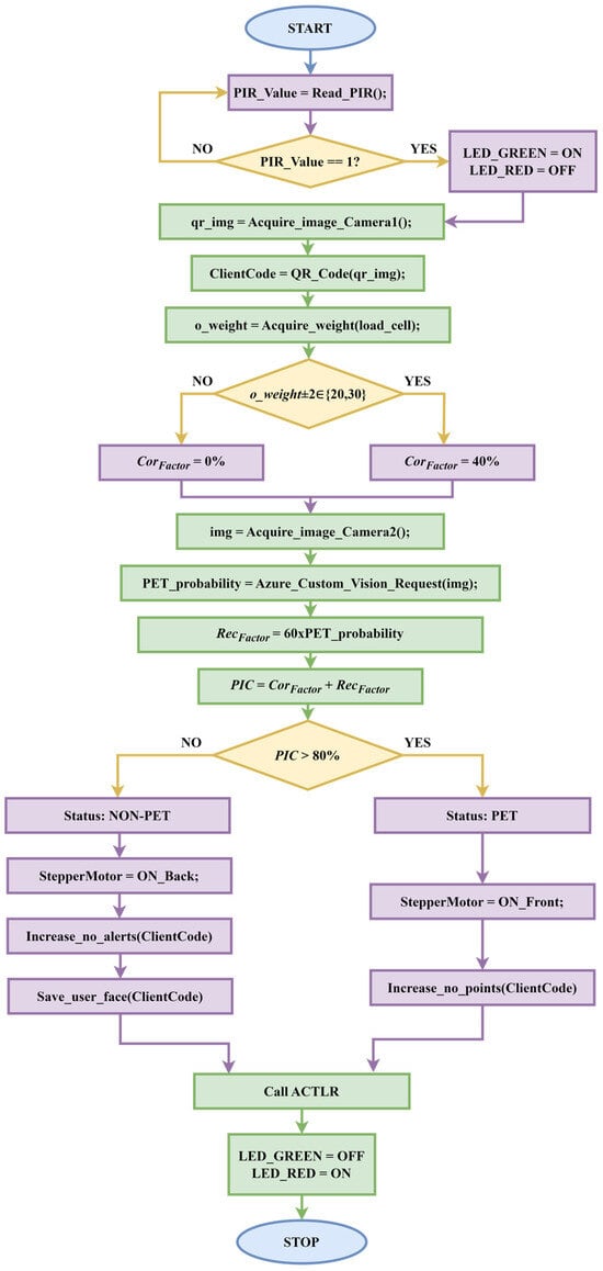 - The design of the PET Bottle Identification Algorithm (PBIA). An advanced algorithm for identifying plastic bottles has been developed, capable of recognizing bottles regardless of color or condition and distinguishing them from other types of waste. The PBIA ensures that only valid PET bottles are accepted by the system. It helps to improve the residential recycling process.
