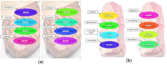 Exposure to visual cues can promote variations in consumption, acceptance, visual attention, and the creation of expectations by the consumer [], which can have a halo effect, modifying the perception of flavor and acceptability of food. In this sense, visual properties are critical for holding visual attention and swaying the choosing of products sold by their own appearance, and not by the packaging design. According to previous studies, foods marketed by their own appearance stand out by visual cues of color, texture, and the perception of flavor stimulated by color []. Regarding beef, studies have shown that the acceptance of beef with information highlighting a dark red color is higher compared to those with a bright red color (cherry red) [,]. Additionally, it was found that intrinsic and extrinsic visual cues significantly influence consumer emotions, hedonic perception, and even food purchase intention, and the provision of additional information, such as names or information on the packaging, can increase the choice and probability of purchase [].