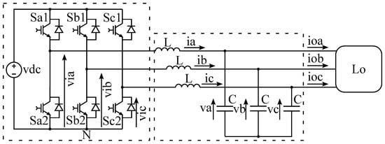 Topology of the three-phase, two-level VSI connected through an filter to an isolated load.