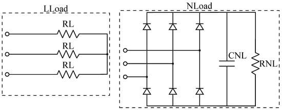 To assess the efficacy of the control schemes within the scope of real-time results, a non-linear load was considered. This configuration comprises a three-phase rectifier connected in parallel with a capacitance () and a resistance (), as shown in Figure 2. Furthermore, the linear load, depicted in Figure 2, is made up of a three-phase load ().