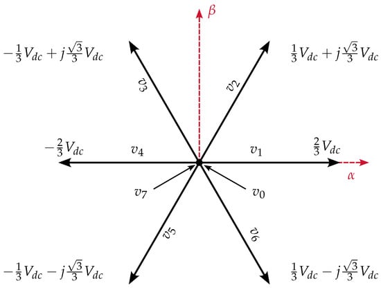 The voltage vector (), as indicated in Figure 3, is defined by Equation (8) using Equations (4) and (7).