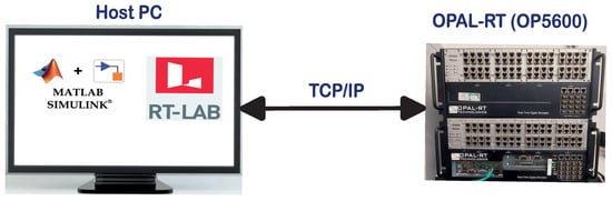 Real-time experimentation in this study was conducted using the OPAL-RT OP5600 simulation platform. This state-of-the-art apparatus, located in the FlexElec Laboratory within the Energy Technologies Building at the University of Nottingham, provides a robust environment for advanced power electronics research. The complete test configuration, including the real-time setup, is illustrated in Figure 6.