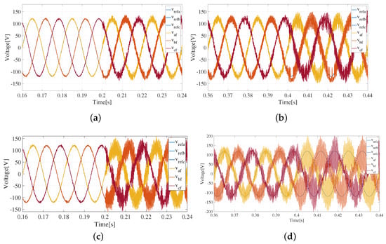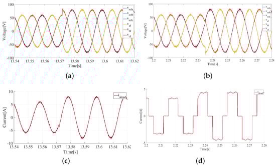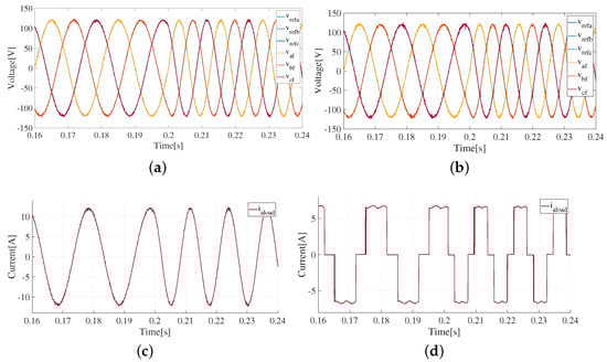 In addition, the waveforms obtained for the load current () for the cases of linear and non-linear loads are shown in Figure 7c and Figure 7d, respectively.